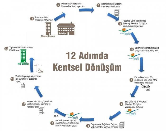11-Binanın yeniden inşaatı ve güçlendirme uygulaması için kat maliklerinin ortak karar ile seçeceği müteahhit – inşaat şirketi ile sözleşme yapılır ve yeni binanızın inşaatına başlanır. (Yeni binanızın inşaatı yapı denetim şirketleri ve kentsel dönüşüm kredisi kullandı iseniz bankaların uzmanları tarafından her aşamada denetlenir.)